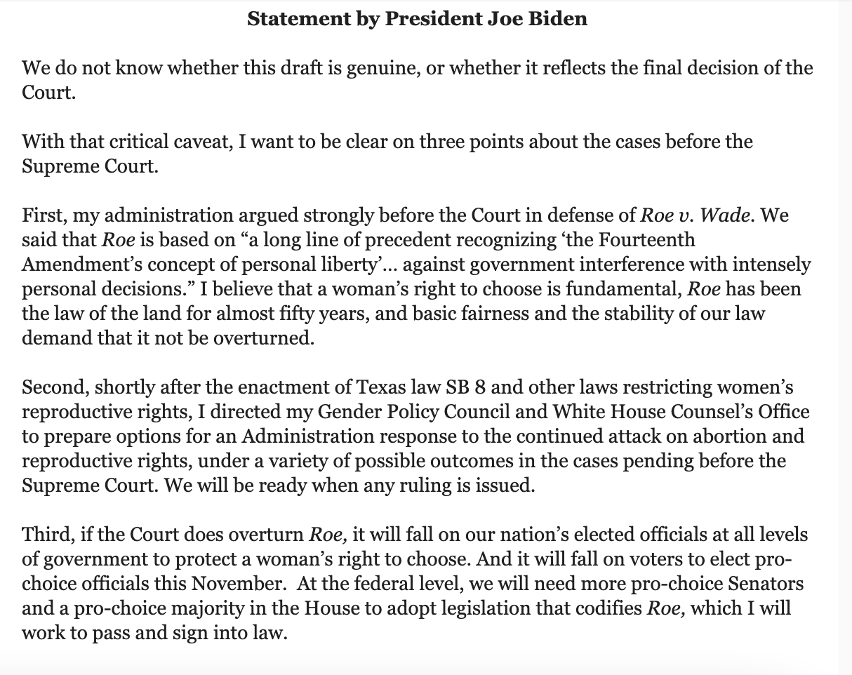 “If the Court does overturn Roe, it will fall on our nation’s elected officials at all levels of government to protect a woman’s right to choose,” Biden said. “And it will fall on voters to elect pro-choice officials this November. At the federal level, we will need more pro-choice Senators and a pro-choice majority in the House to adopt legislation that codifies Roe, which I will work to pass and sign into law.”