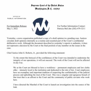 “Court employees have an exemplary and important tradition of respecting the confidentiality of the judicial process and upholding the trust of the Court. This was a singular and egregious breach of that trust that is an affront to the Court and the community of public servants who work here. I have directed the Marshal of the Court to launch an investigation into the source of the leak.”