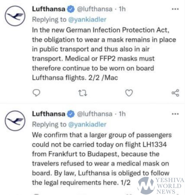 I was on this flight. There were indeed Jewish and non Jewish people arguing with the staff re: mask wearing. However, by no means was it only chassidim or all of the Jews. In the airport they called up all the Goyim to board the flight and told all the Jews (plenty non chassidim) that we are banned from any Lufthansa flight until the next day. They kept saying “the whole group is banned.” Many like myself and my daughter were not part of any group and when I asked the supervisor what makes me part of any group she kept saying “the whole group!” When I asked her if I am considered part of the group because I am Jewish, she, sadly, said YES. There were people recording videos of these conversations so when Lufthansa inevitably denies it they will be proven wrong. 2022 in the free country of Germany…very disturbing.