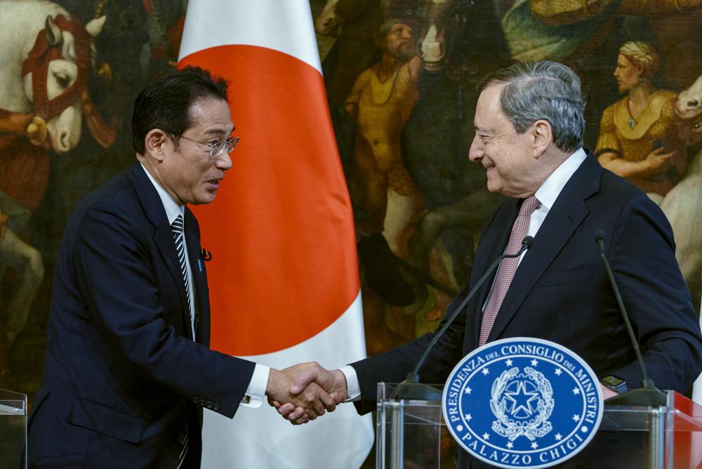 Japanese Prime Minister Fumio Kishida, left, and Italian Premier Mario Draghi shake hands at the end of press point at Chigi Palace government office in Rome, Wednesday, May 4, 2022. Kishida is in Italy and the Vatican, where he met Pope Francis, as part of a six-nation overseas trip. (AP Photo/Domenico Stinellis)