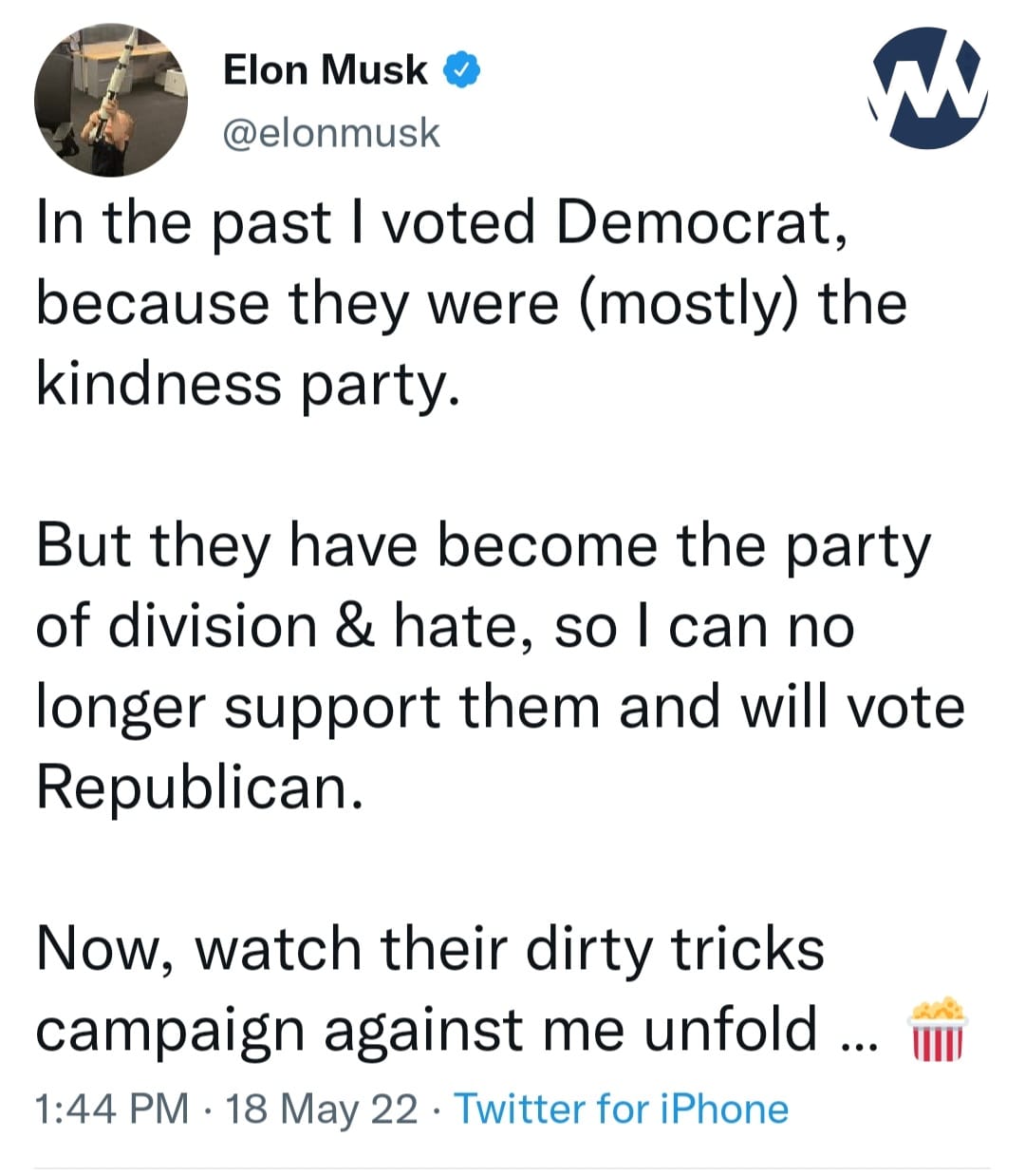 Musk followed his comments up with a tweet saying that he voted Democrat in the past, but won’t do so again because they’ve become the “party of hate and division.”