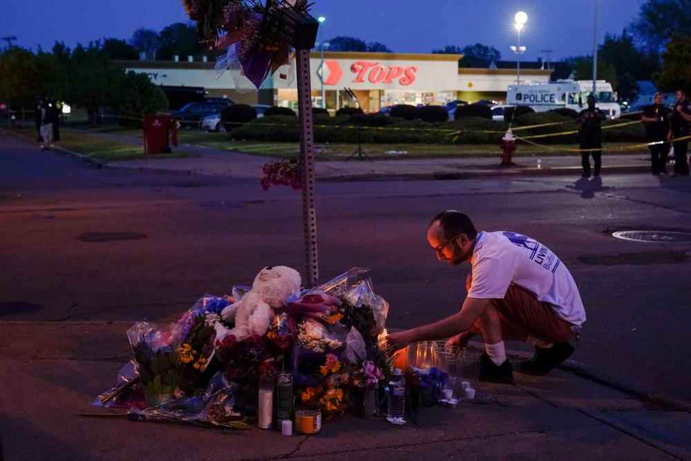 FILE - A person pays his respects at a makeshift memorial outside the scene of a shooting at a supermarket in Buffalo, N.Y., Sunday, May 15, 2022. (AP Photo/Matt Rourke, File)
