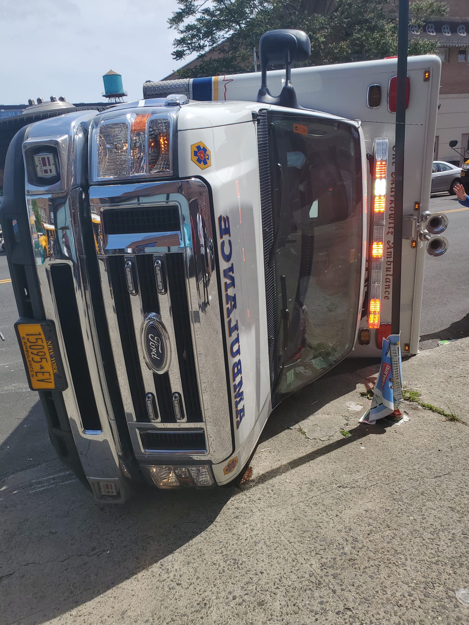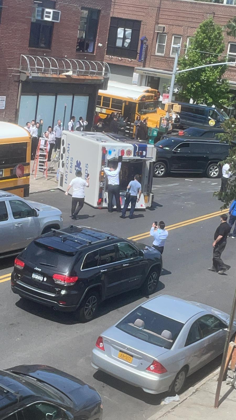 A Boro Park Hatzolah ambulance overturned at 14th Avenue and 39th Street on Thursday morning.