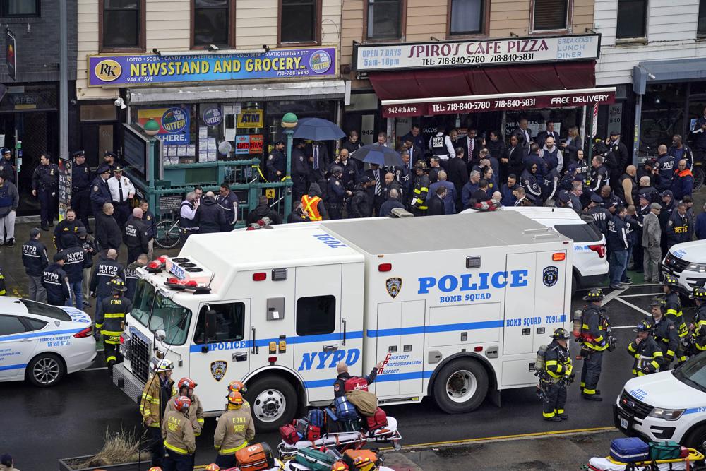 FILE - Emergency personnel gather at the entrance to a subway station in the Brooklyn borough of New York, after a gunman filled a rush-hour subway train with smoke and shot multiple people, April 12, 2022. A woman wounded in the shooting has filed a lawsuit against gun manufacturer Glock. (AP Photo/John Minchillo, File)