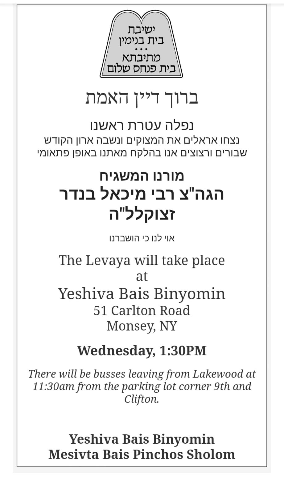 The Levaya will take place on Wednesday at 1:30PM at Yeshiva Bais Binyomin, 52 Carlton Road, Monsey NY.