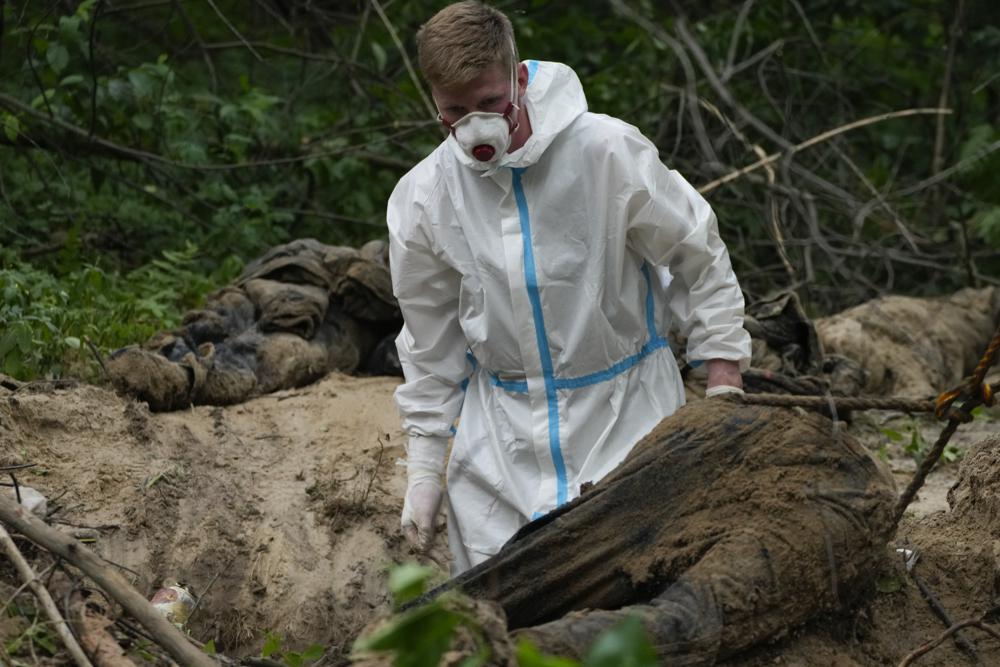 The lush green beauty of a pine forest and singing birds contrasted with the violent deaths of newly discovered victims of Russia’s war in Ukraine, as workers exhumed bodies from another burial site near Bucha on Kyiv’s outskirts.