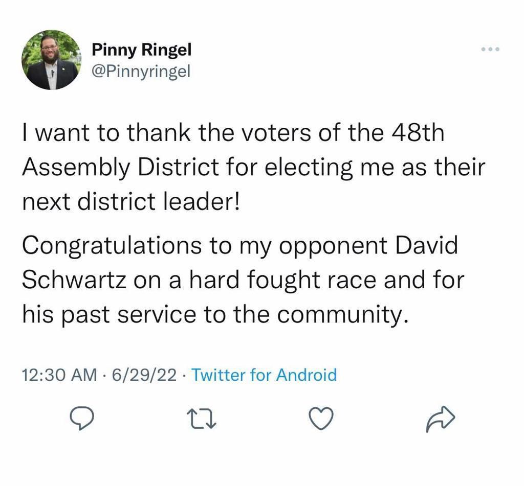 Longtime community askan Pinny Ringel, an ex-City Hall staffer, has defeated incumbent David Schwartz, in the race for District Leader of the 48th Assembly District in Tuesday’s primary., which covers swaths of Borough Park, Mapleton and Midwood.