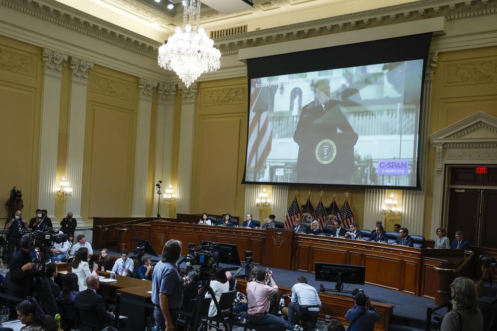 A image of former President Donald Trump is displayed as Cassidy Hutchinson, former aide to Trump White House chief of staff Mark Meadows, testifies as the House select committee investigating the Jan. 6 attack on the U.S. Capitol holds a hearing at the Capitol in Washington, Tuesday, June 28, 2022. (Photo by Anna Moneymaker/Getty Images)