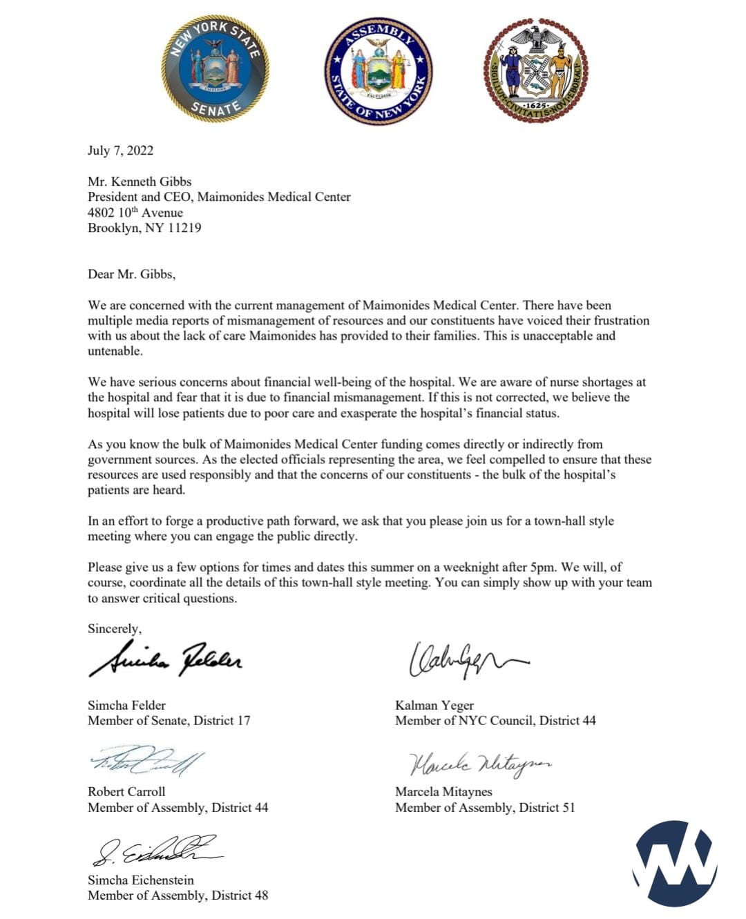 We are concerned with the current management of Maimonides Medical Center. There have been multiple media reports of mismanagement of resources and our constituents have voiced their frustration with us about the lack of care Maimonides has provided to their families. This is unacceptable and untenable.