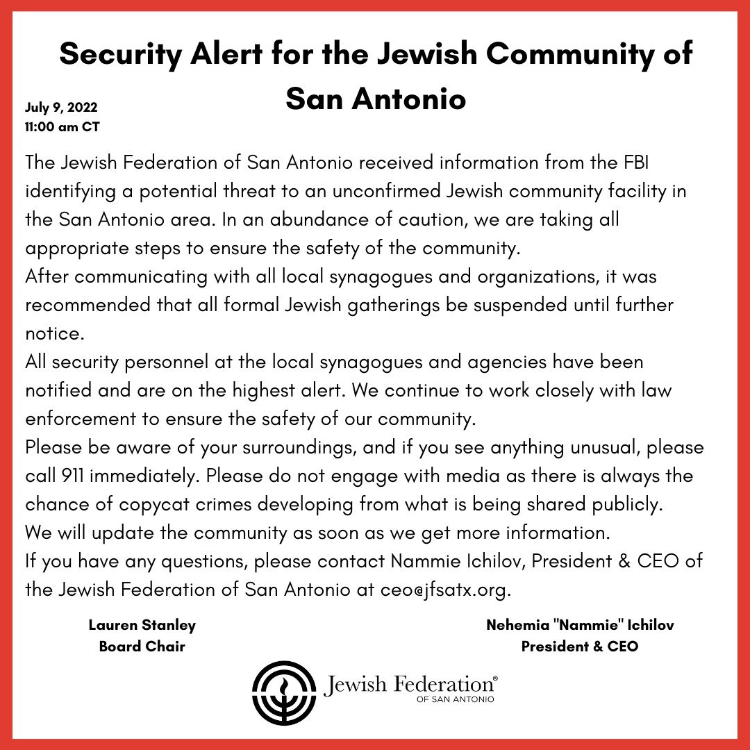 The Jewish Federation of San Antonio said in a statement that all shuls and organizations in the area have been briefed on the matter and that security personnel “are on the highest alert.”