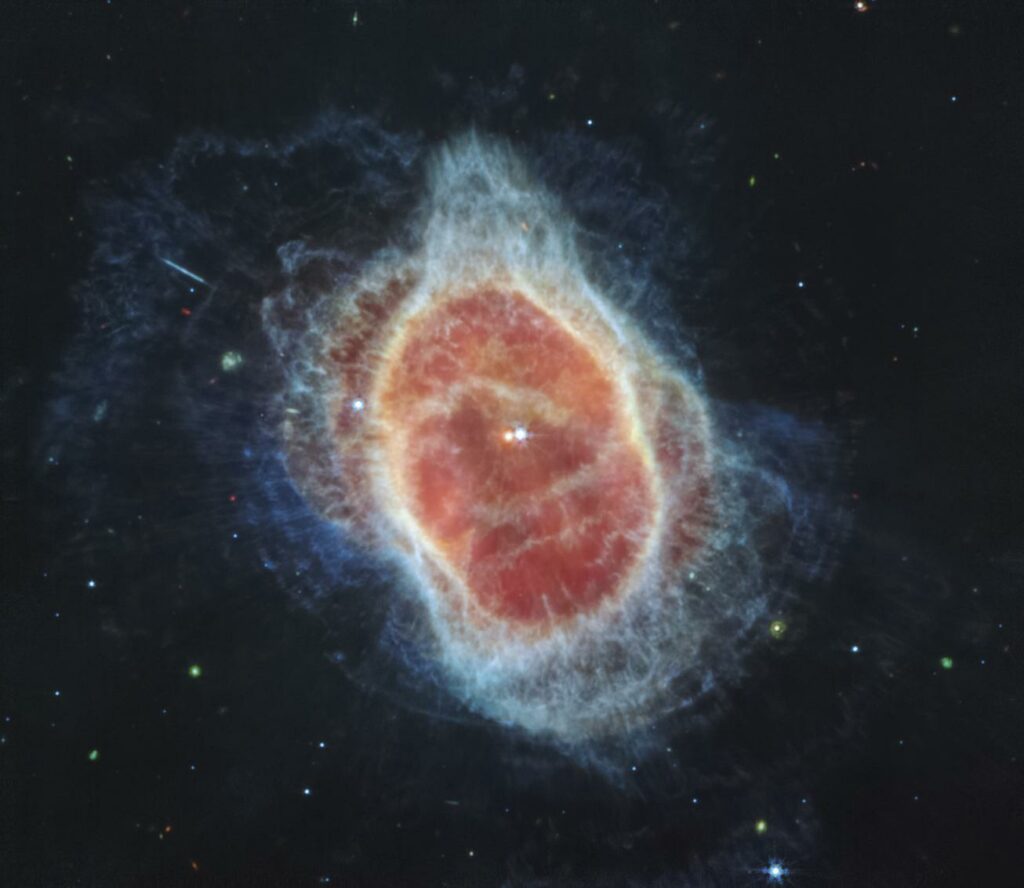 — The Southern Ring Nebula, which is sometimes called “eight-burst.’ About 2,500 light-years away, it shows an expanding cloud of gas surrounding a dying star. A light-year is 5.8 trillion miles.