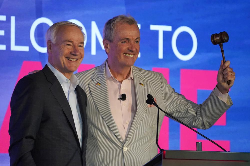 Arkansas Gov. Asa Hutchinson, left, and New Jersey Gov. Phil Murphy acknowledge applause at the National Governors Association summer meeting, Friday, July 15, 2022, in Portland, Maine. (AP Photo/Robert F. Bukaty)