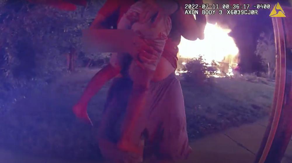 Police body camera video captured the aftermath of the jump, with Bostic backlit by the burning home and walking toward first responders, the girl in his arms.