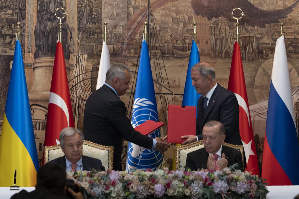 Russian Defense Minister Sergei Shoigu and Ukrainian Infrastructure Minister Oleksandr Kubrakov signed separate, identical deals with Guterres and Turkish Defense Minister Hulusi Akar at a ceremony in Istanbul that was witnessed by Turkish President Recep Tayyip Erdogan.