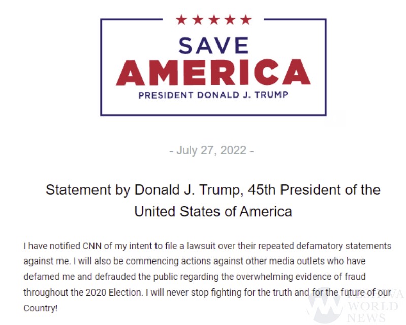 “I have notified CNN of my intent to file a lawsuit over their repeated defamatory statements against me,” Trump said in a statement. “I will also be commencing actions against other media outlets who have defamed me and defrauded the public regarding the overwhelming evidence of fraud throughout the 2020 Election. I will never stop fighting for the truth and for the future of our Country!”