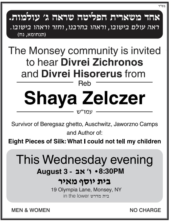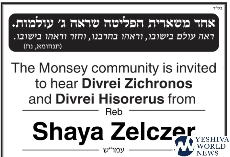 The Monsey community is invited to hear Divrei Zichronos and Divrei Hisorerus from Reb Shaya Zelczer.