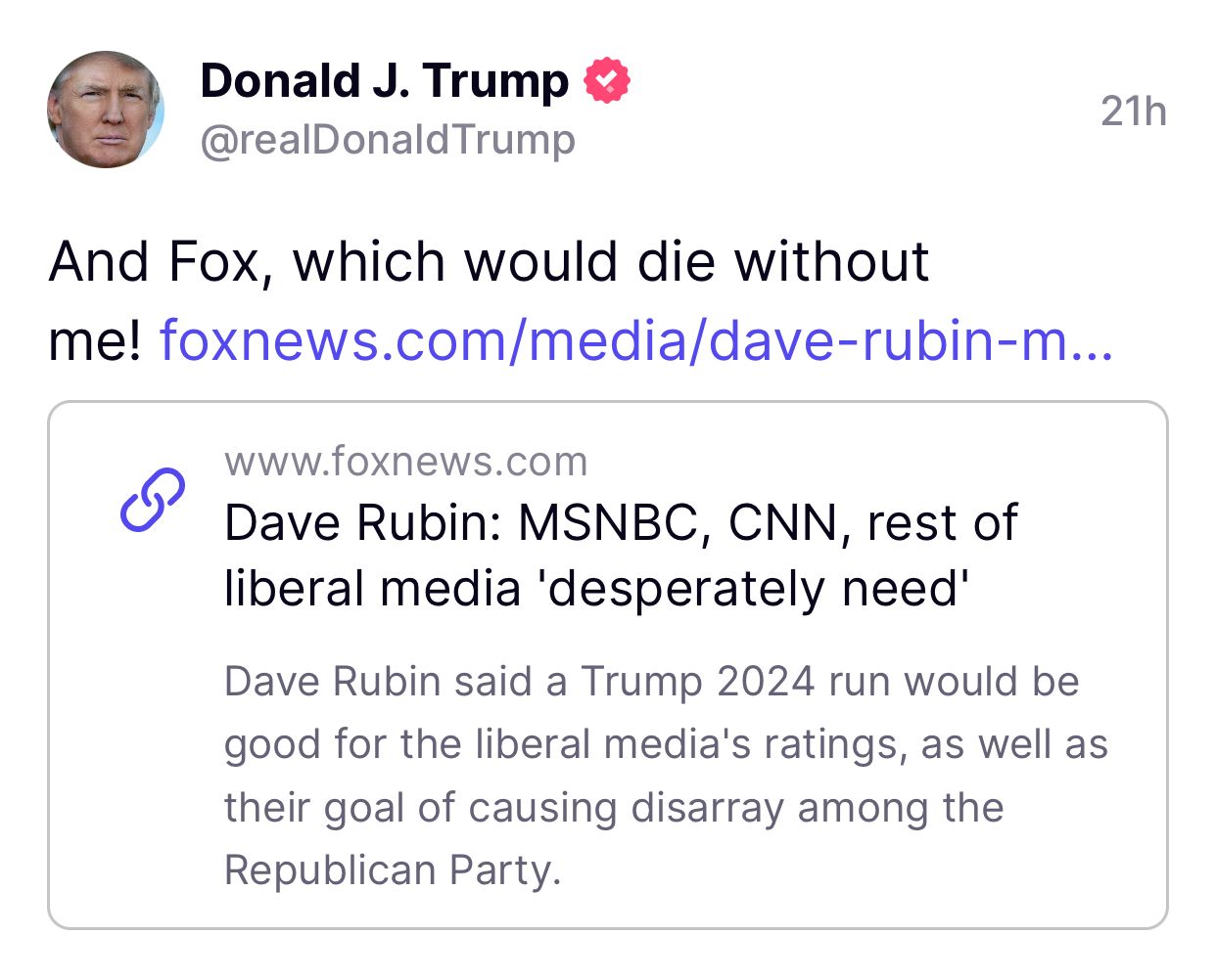 Trump added on Truth Social: “And Fox, which would die without me!”