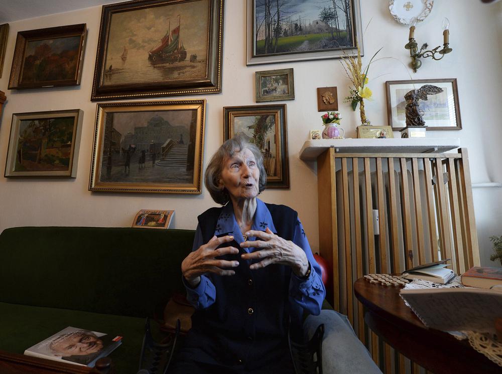 FILE - Zofia Posmysz, a 96-year-old Polish Catholic woman who survived the Nazi German concentration camps of Auschwitz and Ravensbrueck, poses at her home in Warsaw, Poland, Tuesday, Jan. 14, 2020. Posmysz, who later became a journalist and author of the novels including “The Passenger,” died Monday, Aug. 8, 2022, according to the Auschwitz-Birkenau state memorial museum. She was 98. (AP Photo/Czarek Sokolowski, File)