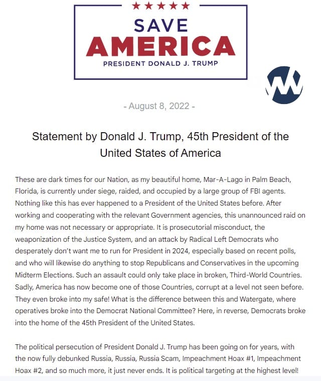 “After working and cooperating with the relevant Government agencies, this unannounced raid on my home was not necessary or appropriate,” Trump said in his statement.