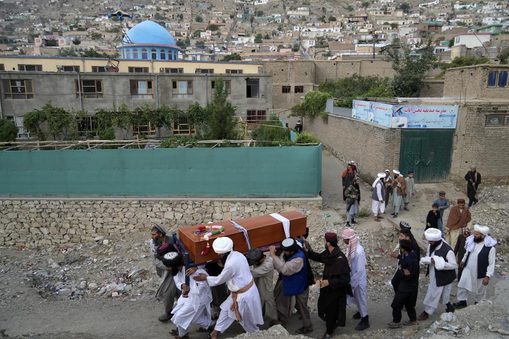AP journalists could see the blue-roofed, Sunni mosque from a nearby hillside. The Taliban parked police trucks and other vehicles at the mosque, while several men carried out one casket for a victim of the attack.