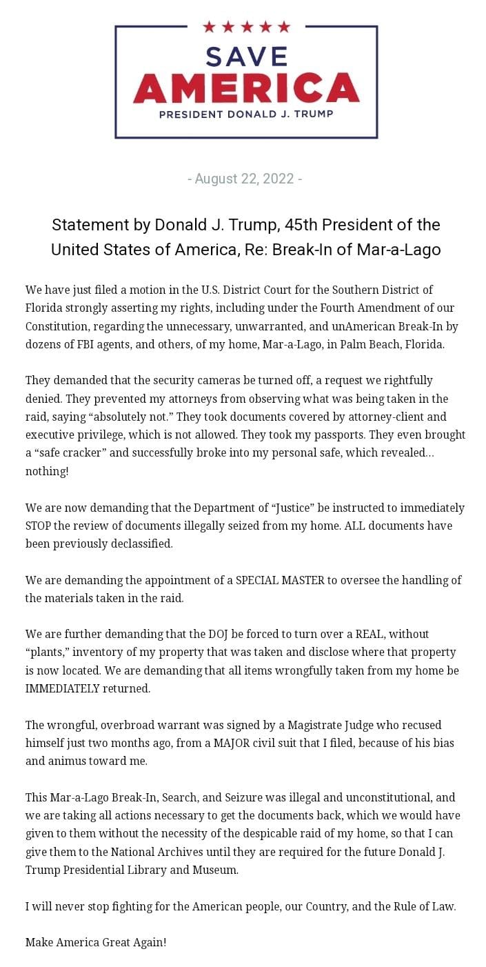 Too late and preposterous. The FBI receival was certainly not unwarranted as there was a valid warrant signed by a judge. One Trump left office there is absolutely no executive privilege for him. The documents taken were not his property. Everything taken was lawful property of the United States Government even the passports, which if American, clearly say “property of the US government” on them.