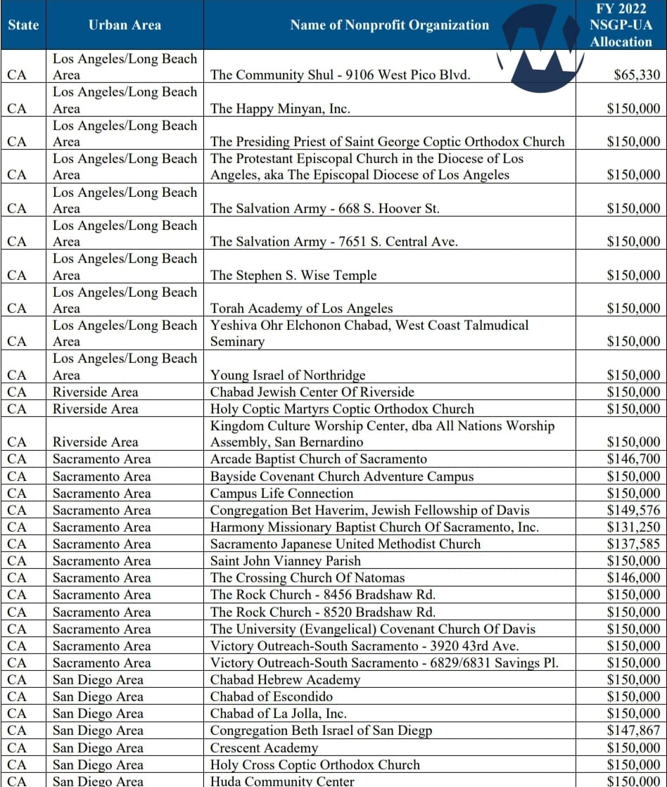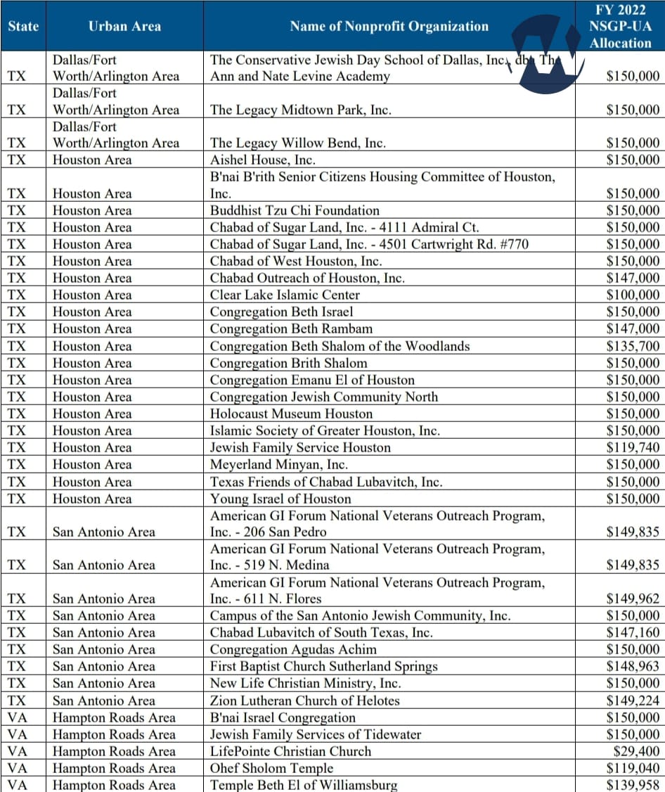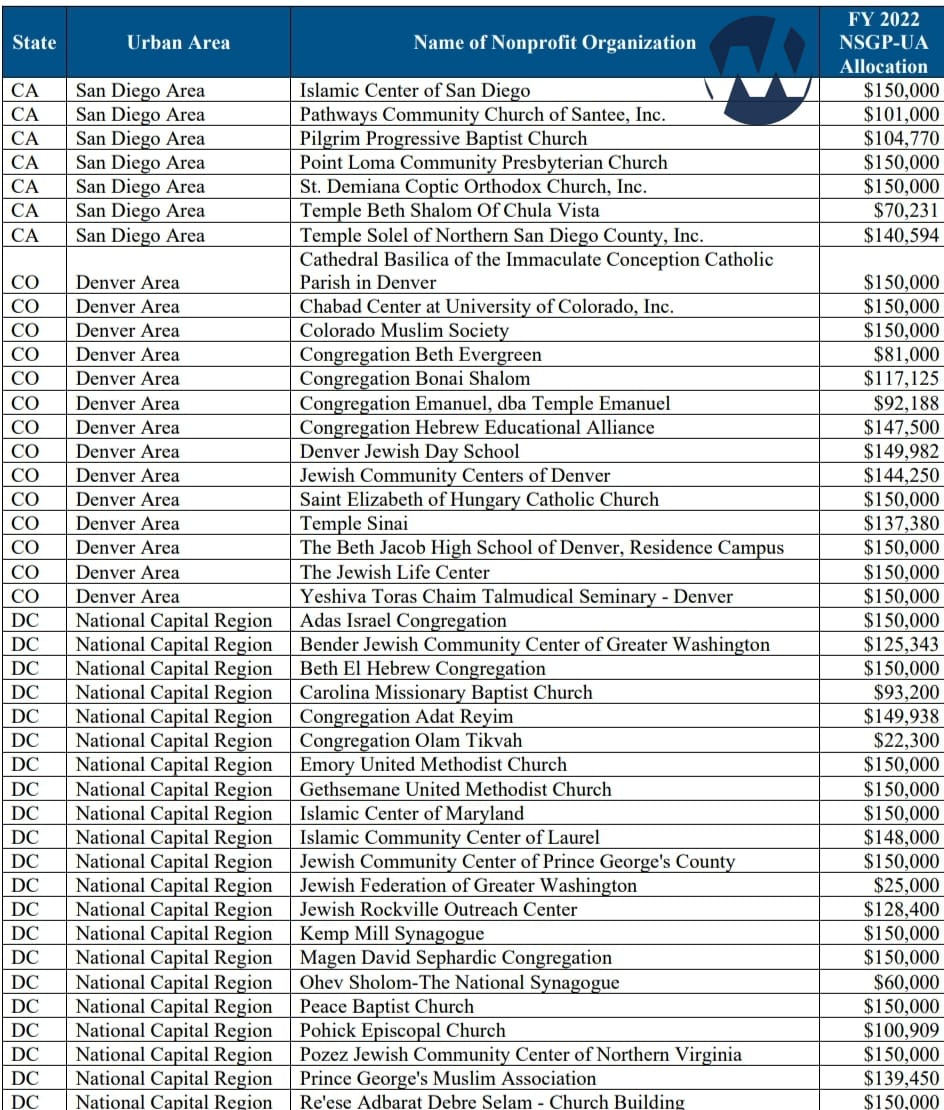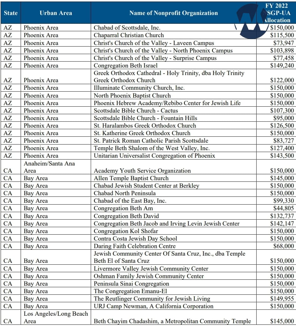 The below graphics show the awardees of the FY 2022 Nonprofit Security Grant Program, along with the amount they will be given.