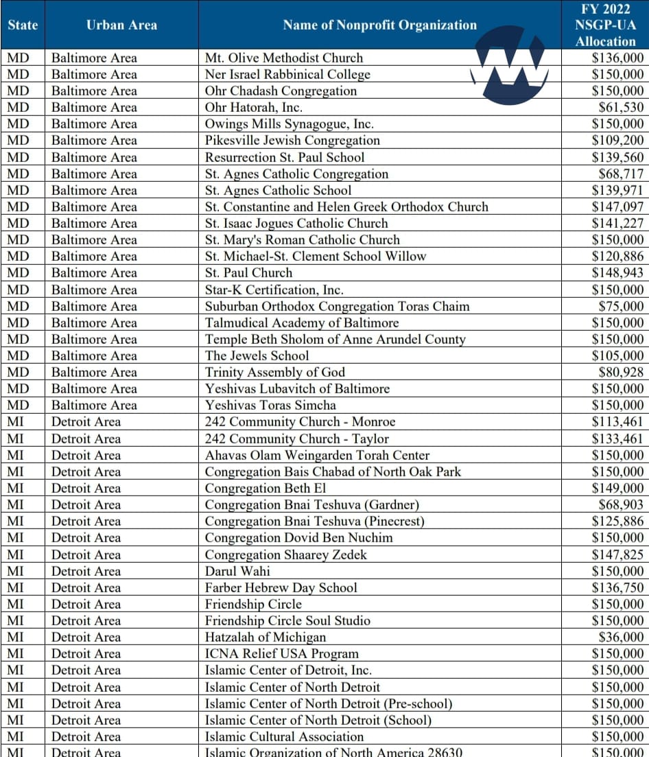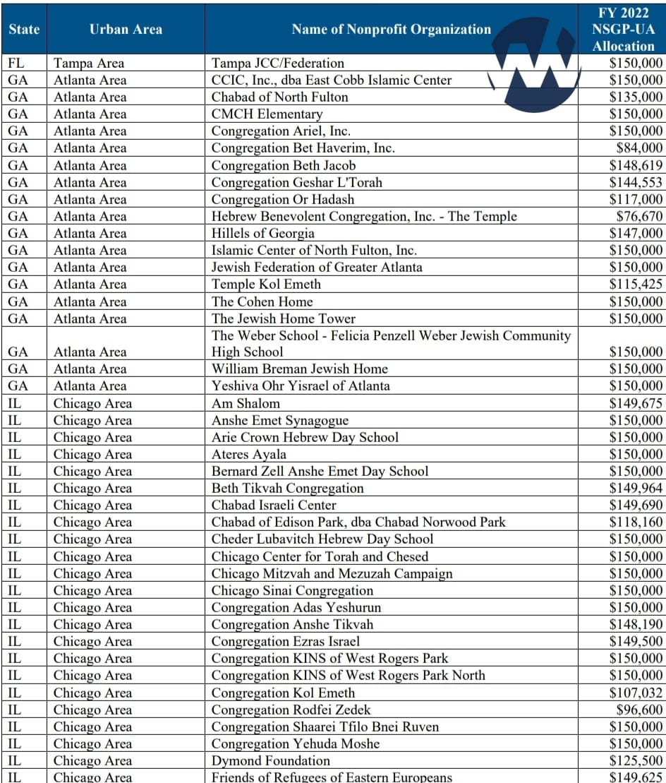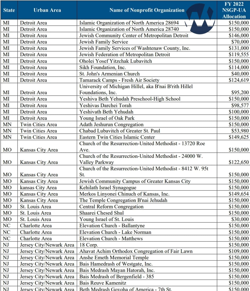 The below graphics show the awardees of the FY 2022 Nonprofit Security Grant Program, along with the amount they will be given.