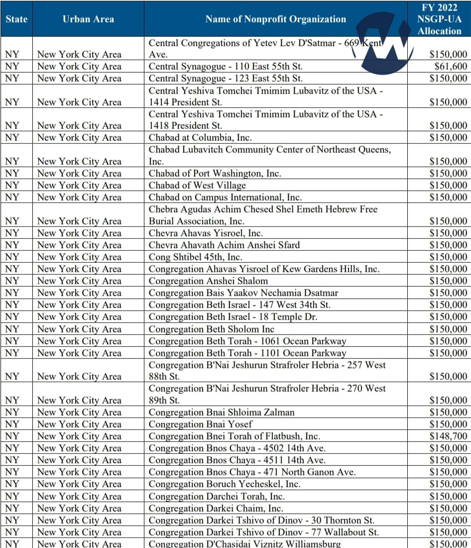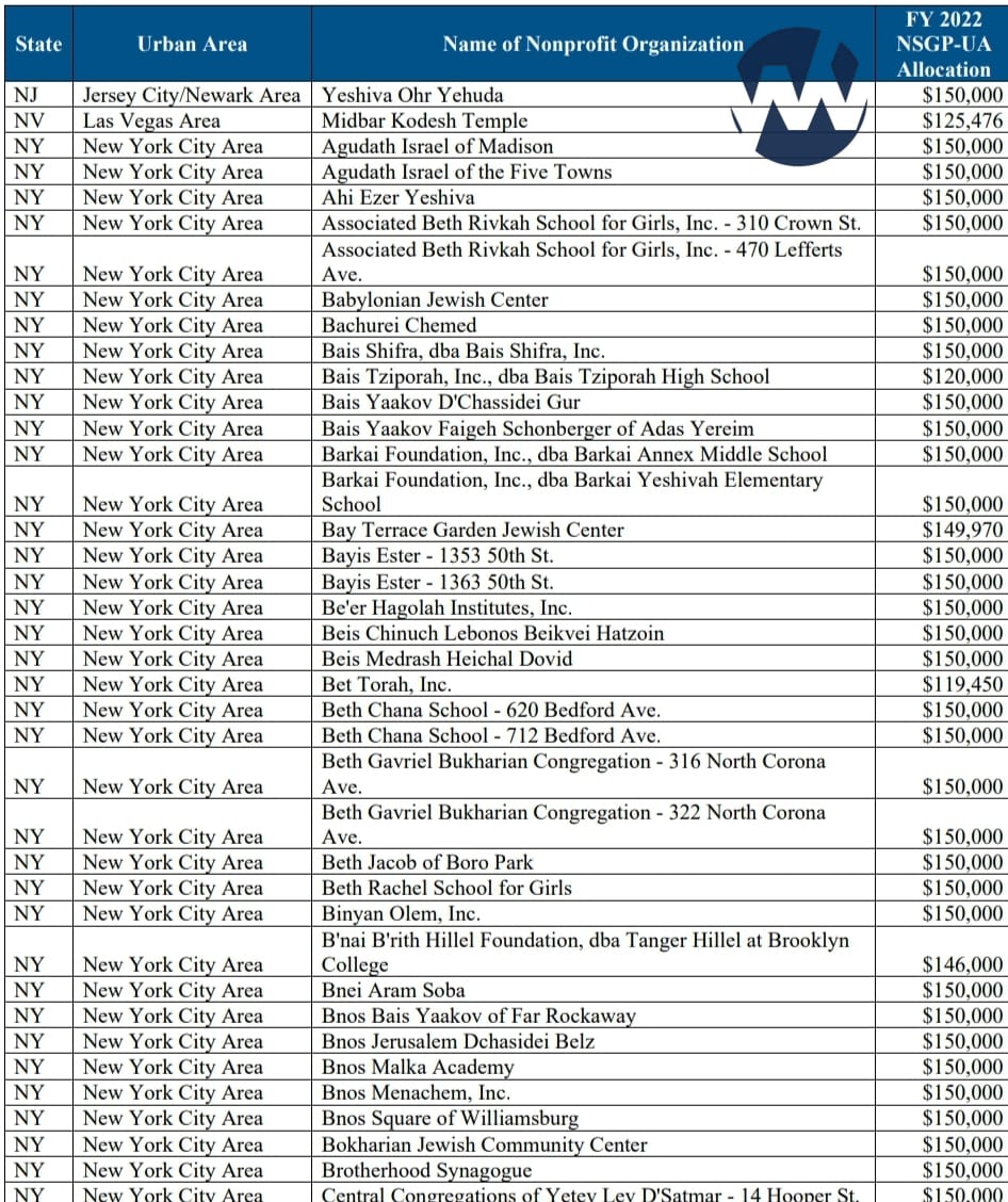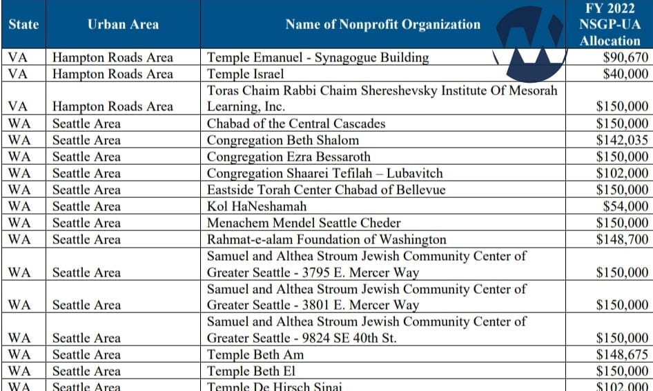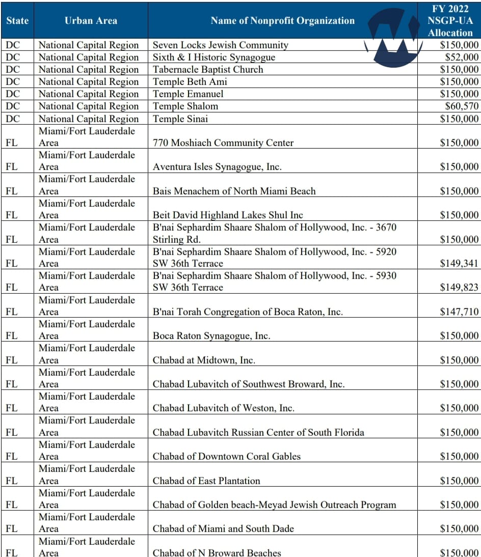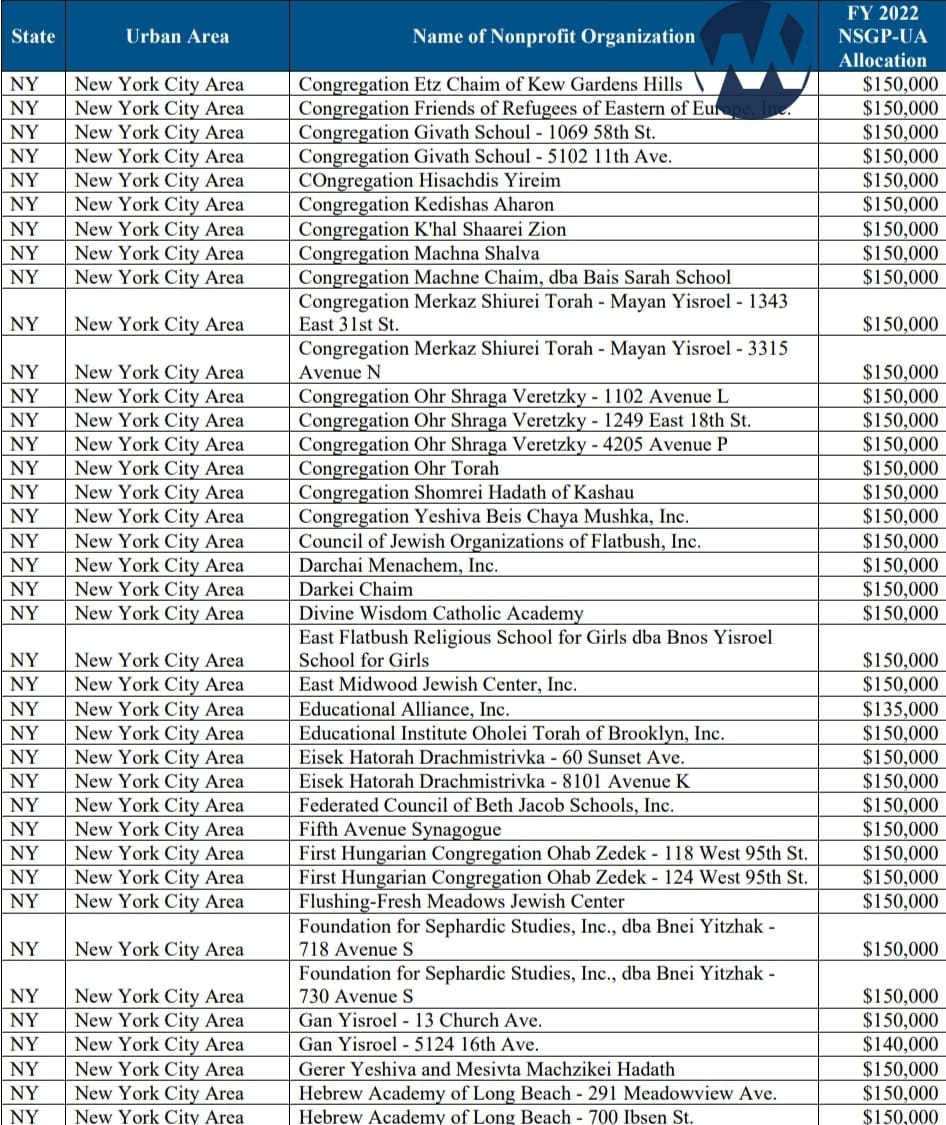 The Federal Emergency Management Administration (FEMA), a branch of the Department of Homeland Security, announced the recipients of funding under the FY 2022 Nonprofit Security Grant Program, which include dozens of shuls, yeshivos, schools, and organizations across the United States.
