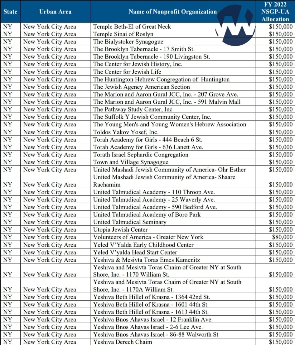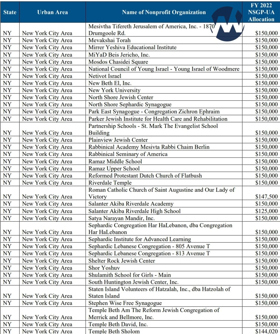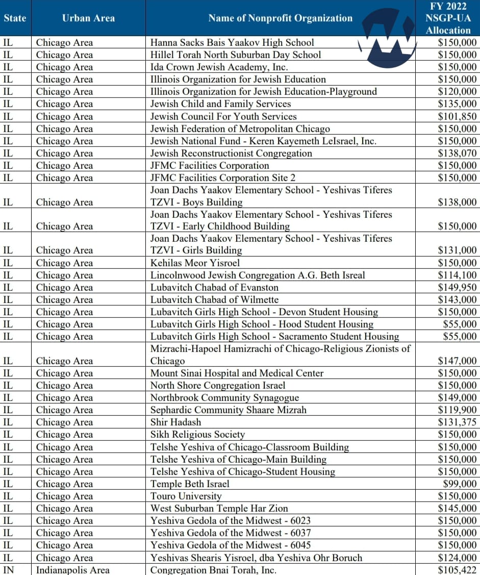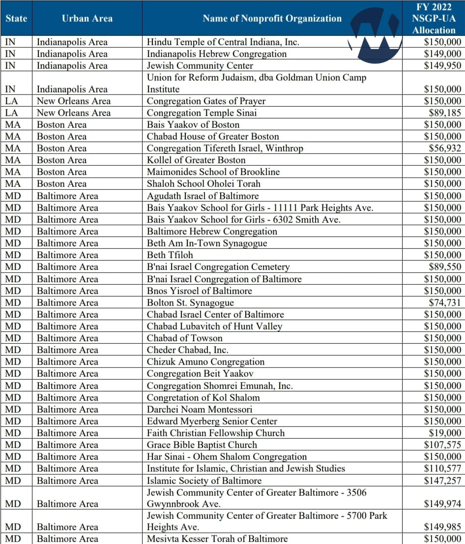 The Federal Emergency Management Administration (FEMA), a branch of the Department of Homeland Security, announced the recipients of funding under the FY 2022 Nonprofit Security Grant Program, which include dozens of shuls, yeshivos, schools, and organizations across the United States.