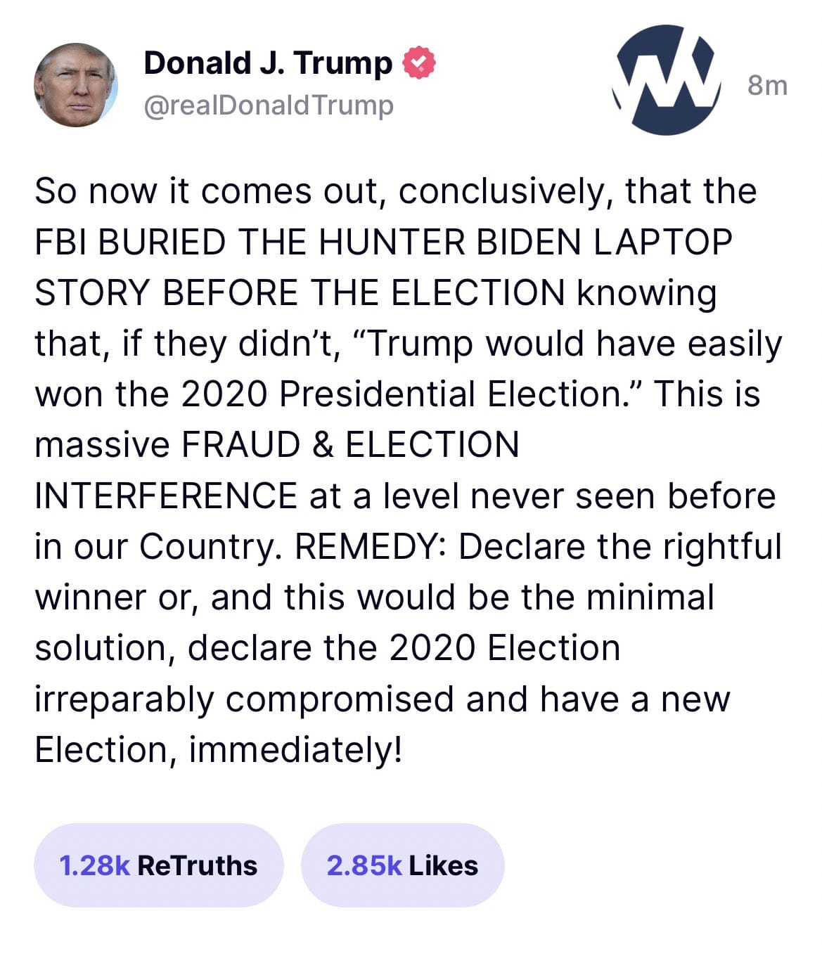 “So now it comes out, conclusively, that the FBI BURIED THE HUNTER BIDEN LAPTOP STORY BEFORE THE ELECTION knowing that, if they didn’t, ‘Trump would have easily won the 2020 Presidential Election,'” Trump wrote on his personal Truth Social account. “This is massive FRAUD & ELECTION INTERFERENCE at a level never seen before in our Country.”
