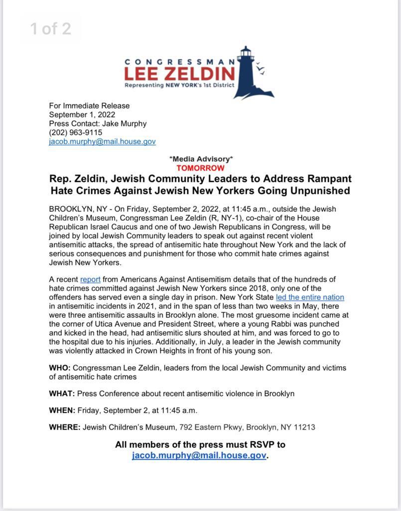 Zeldin, currently representing NY-1 in the House of Representatives, is the co-chair of the House Republican Israel Caucus and one of two Jewish Republicans in Congress. He will be joined by local Jewish Community leaders to speak out against the recent violent antisemitic attacks, the spread of antisemitic hate throughout New York and the lack of
