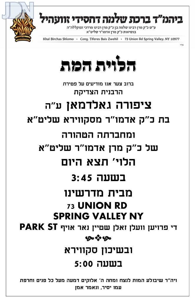 YWN regrets to inform you of the Petira of Rebbitzen Tziporah Goldman A”H, a daughter of the Skverer Rebbe, and wife of the Zvhiller Rebbe of Monsey (HaRav Eliezer Goldman).