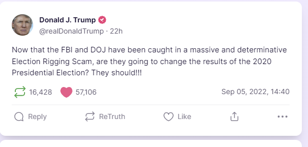“Now that the FBI and DOJ have been caught in a massive and determinative Election Rigging Scam, are they going to change the results of the 2020 Presidential Election? They should!!!” Trump wrote on Truth Social.