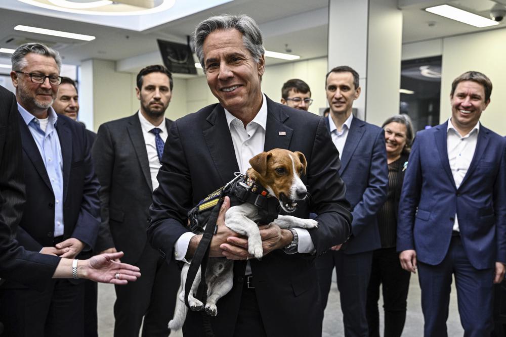 In the hospital lobby, Blinken also met Patron, a Jack Russell terrier that has helped Ukraine’s military find more than 200 mines laid by Russian forces. Blinken kneeled down, petted the dog and presented him with treats, saying he was “world famous.”
