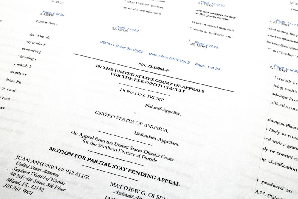 The department told the 11th Circuit U.S. Court of Appeals in Atlanta that the judge’s hold, imposed last week, had impeded the “government’s efforts to protect the nation’s security” and interfered with its investigation into the presence of top-secret information at Mar-a-Lago. It asked the court to remove that order so work could resume, and to halt a judge’s directive forcing the department to provide the seized classified documents to an independent arbiter for his review.