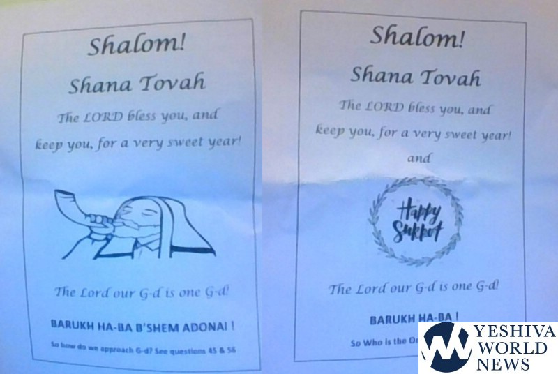 One Flatbush resident tells YWN that he received two pamphlets to his home from a missionary organization in the past week alone. A photo of the pamphlets show that the missionaries are trying to use Jewish terms like “Shana Tovah” to lure in unsuspecting Jews.