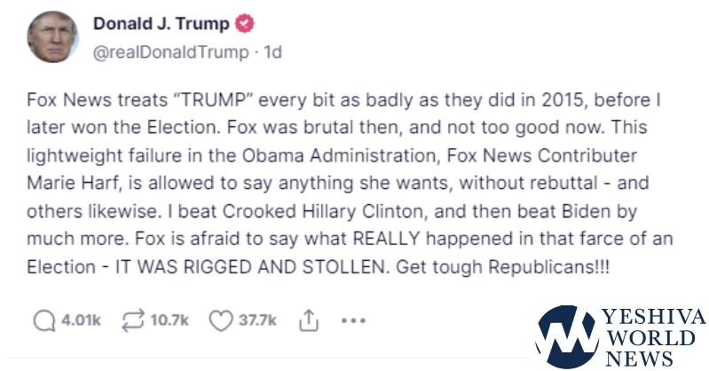 “Fox News treats ‘TRUMP’ every bit as badly as they did in 2015, before I later won the Election. Fox was brutal then, and not too good now. This lightweight failure in the Obama Administration, Fox News Contributer Marie Harf, is allowed to say anything she wants, without rebuttal – and others likewise. I beat Crooked Hillary Clinton, and then beat Biden by much more. Fox is afraid to say what REALLY happened in that farce of an Election – IT WAS RIGGED AND STOLLEN. Get tough Republicans!!!” Trump wrote on Truth Social.