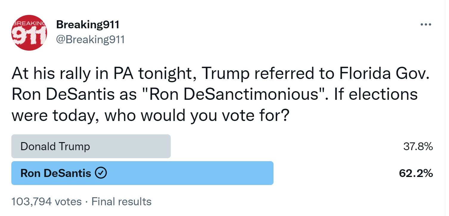 The obvious disdain which Trump has for DeSantis over the possibility that the latter might challenge him for the 2024 nomination, comes following a fascinating, though unscientific, survey from Breaking911 on Twitter, which found that 62% of respondents would vote for DeSantis over Trump.