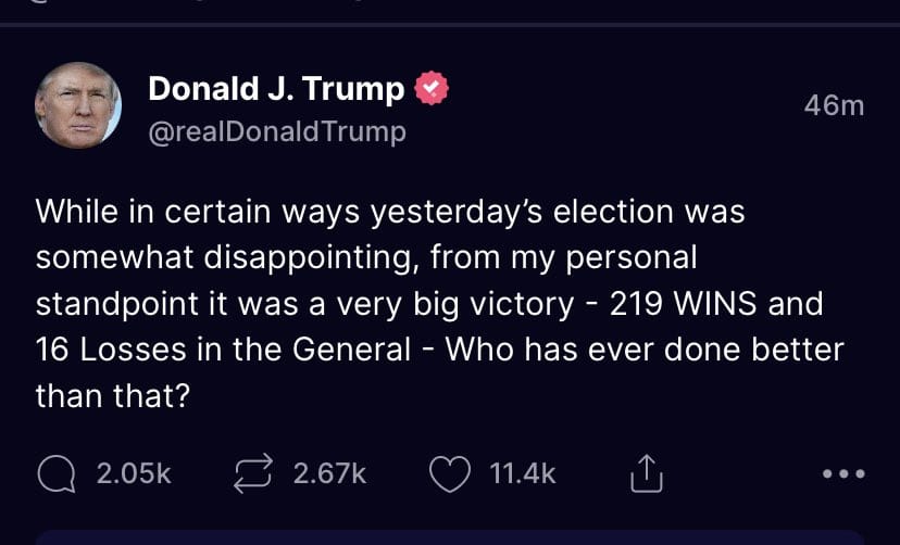 In a post on Truth Social, Trump wrote: “While in certain ways yesterday’s election was somewhat disappointing, from my personal standpoint it was a very big victory – 219 WINS and 16 Losses in the General – Who has ever done better than that?”