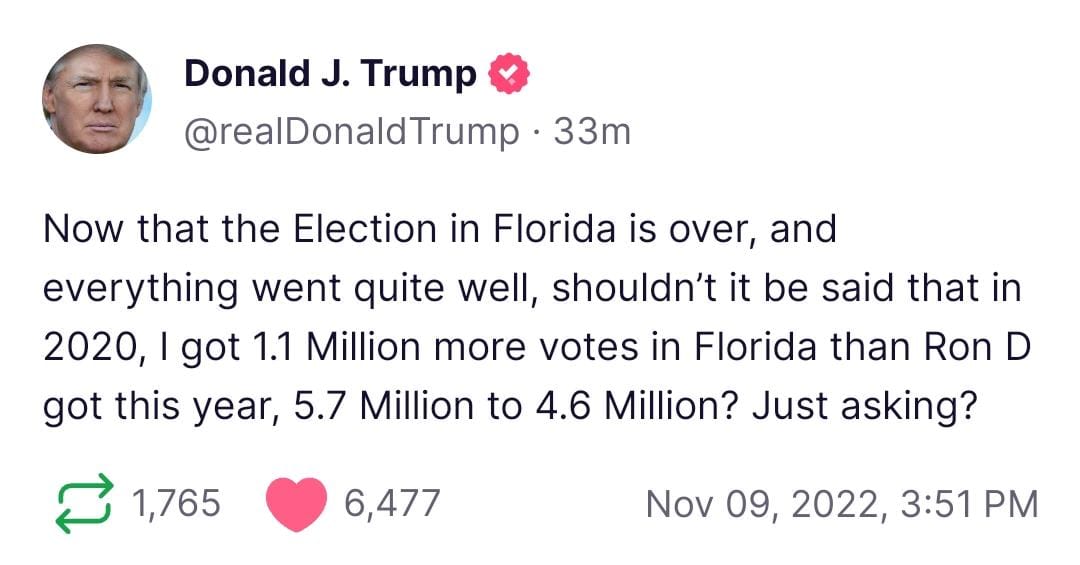 The former president said in another post, “Now that the Election in Florida is over, and everything went quite well, shouldn’t it be said that in 2020, I got 1.1 million more votes in Florida that Ron D got this year, 5.7 million to 4.6 million? Just asking?”