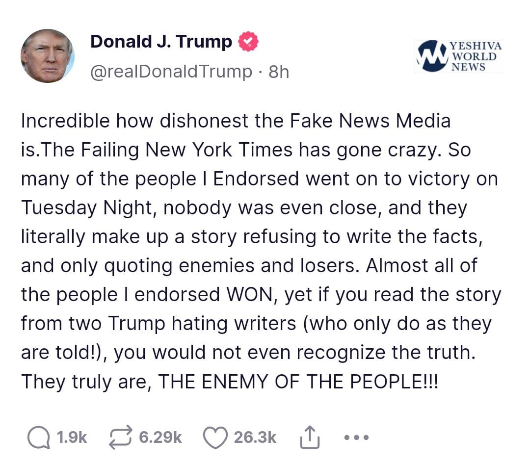 “Incredible how dishonest the Fake News Media is,” Trump raged on Truth Social. “The Failing New York Times has gone crazy. So many of the people I Endorsed went on to victory on Tuesday Night, nobody was even close, and they literally make up a story refusing to write the facts, and only quoting enemies and losers. Almost all of the people I endorsed WON, yet if you read the story from two Trump hating writers (who only do as they are told!), you would not even recognize the truth. They truly are, THE ENEMY OF THE PEOPLE!!!”