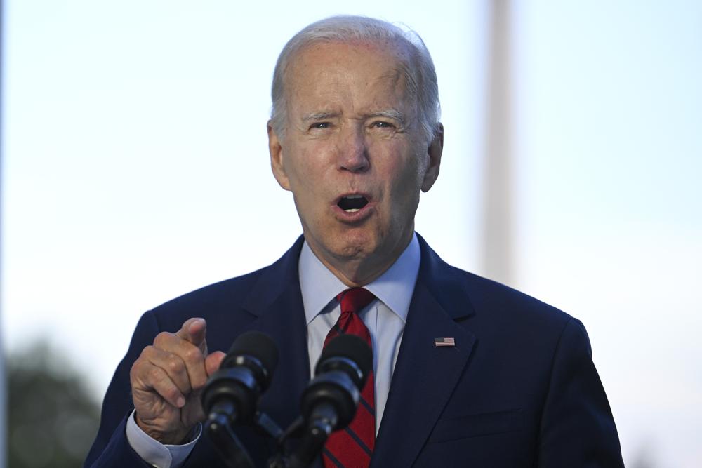 FILE - President Joe Biden speaks from the Blue Room Balcony of the White House Monday, Aug. 1, 2022. (Jim Watson/Pool via AP, File)