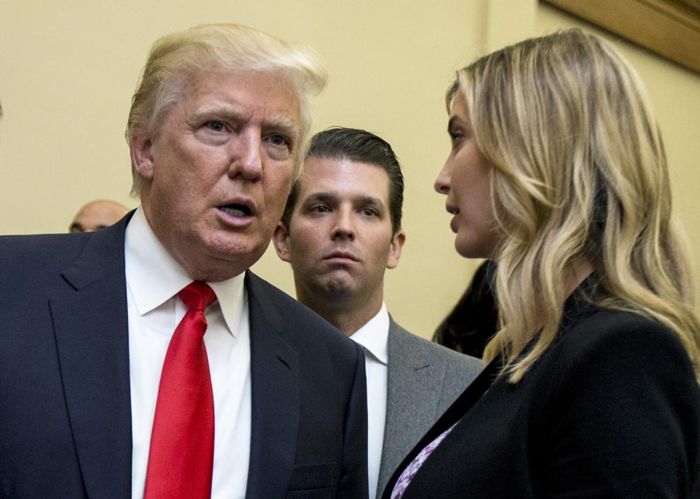 FILE - Donald Trump, left, Donald Trump Jr., center, and his daughter Ivanka Trump speak during the unveiling of the design for the Trump International Hotel in the The Old Post Office in Washington, on Sept. 10, 2013. (AP Photo/Manuel Balce Ceneta, File)