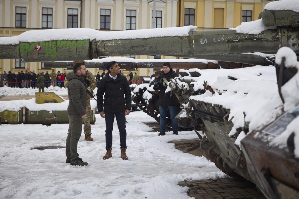 As snowflakes fell, Zelenskyy greeted Sunak at a presidential palace for their talks. He called the two countries “the strongest of allies.” Walking in the snow, they also inspected captured Russian tanks and other destroyed and rusting military hardware used by the invasion forces that are displayed in a Kyiv square.