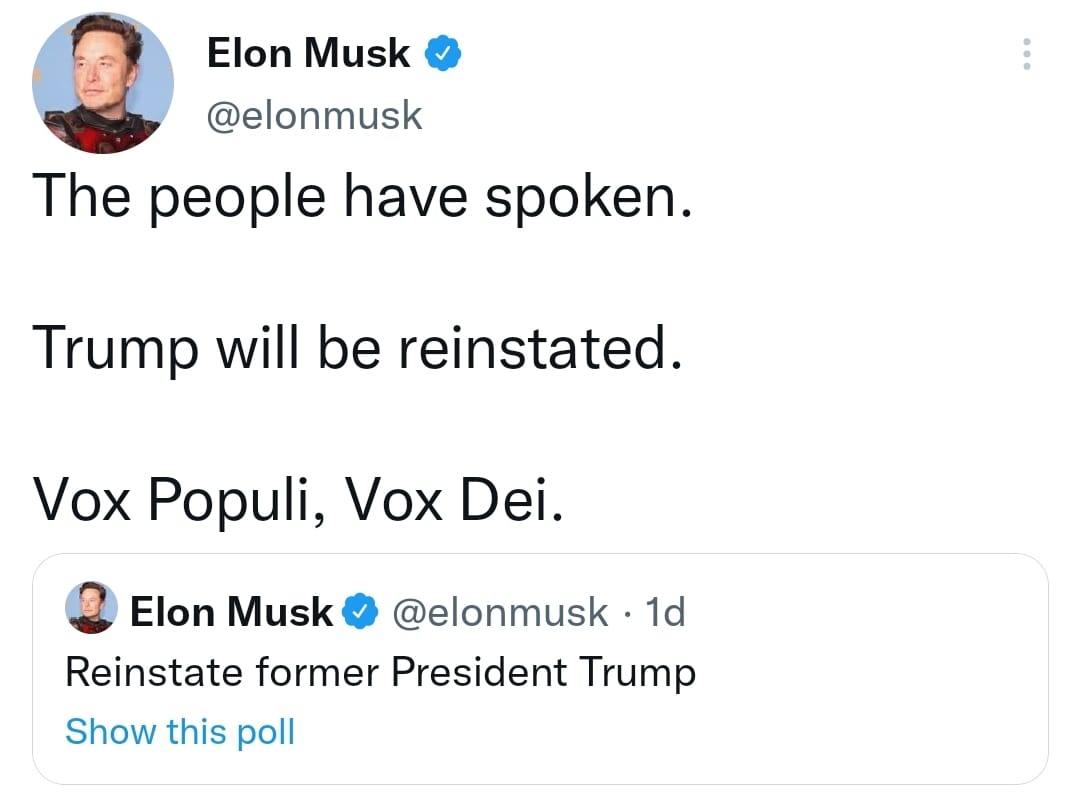 Minutes after the poll’s conclusion, Musk tweeted that Trump will be reinstated, as “the people have spoken.”