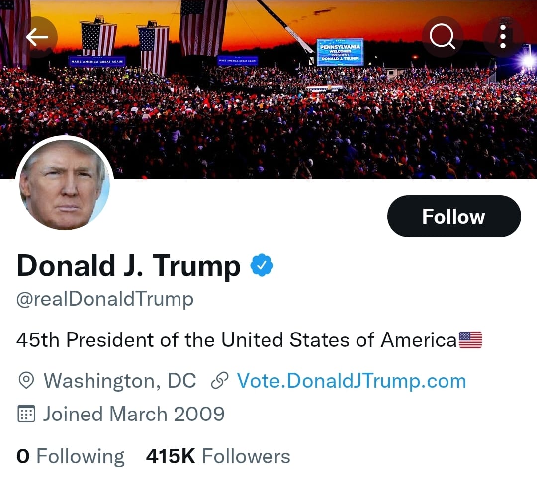 Minutes later, Trump’s Twitter account went live again. While Trump’s followers numbers seems to be low at this point compared to the tens of millions he once had, his followers will be re-added as Twitter puts them all back on his account.