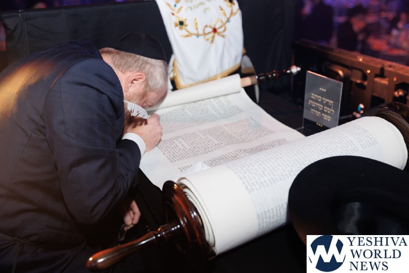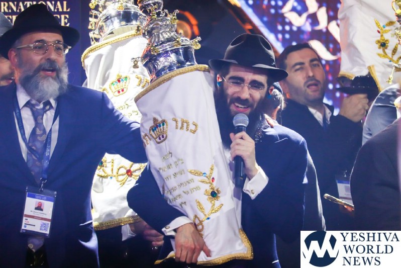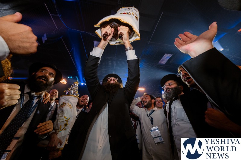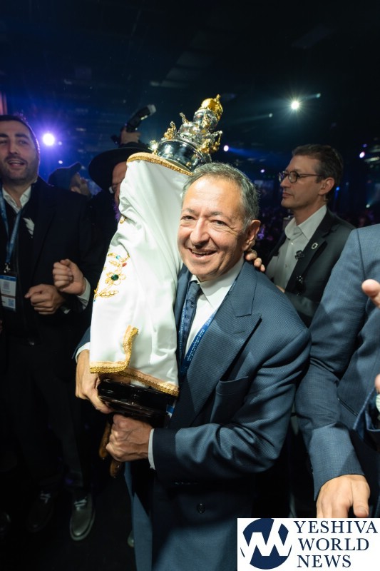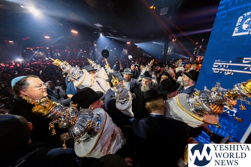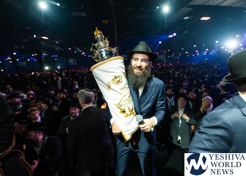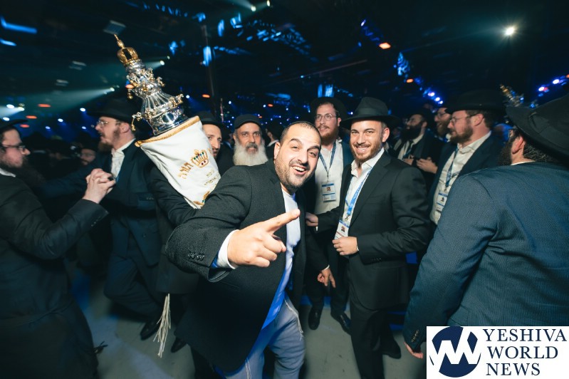 The evening concluded with the hoisting up of 36 new Torah scrolls—each of which will be sent to another Chabad center around the globe—before the scrolls were joyously carried around the cavernous hall during the jubilant dancing that capped the evening.