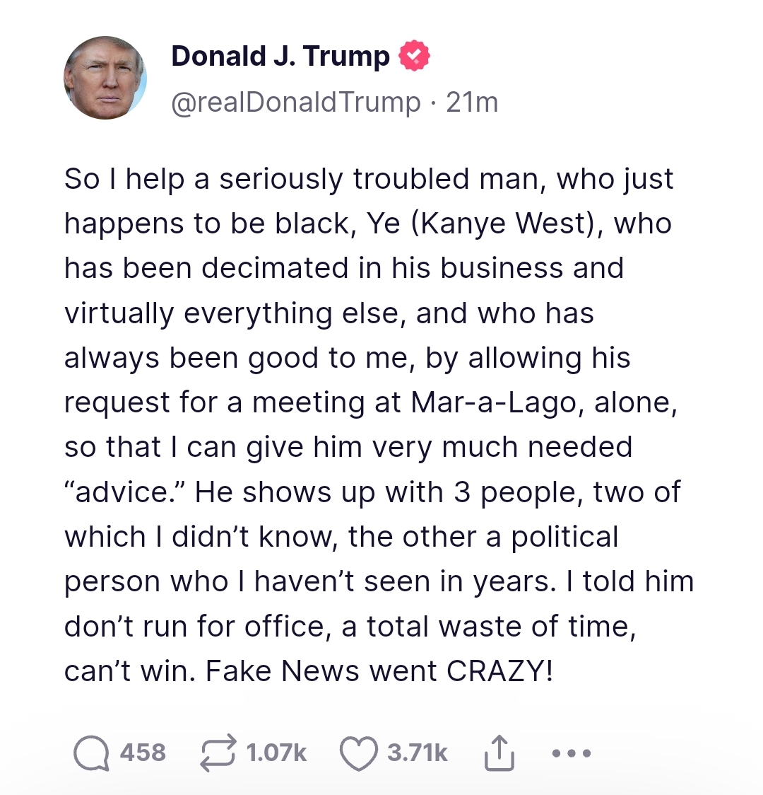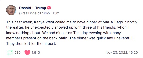 Trump responded to the story on Friday, writing on Truth Social: “This past week, Kanye West called me to have dinner at Mar-a-Lago. Shortly thereafter, he unexpectedly showed up with three of his friends, whom I knew nothing about. We had dinner on Tuesday evening with many members present on the back patio. The dinner was quick and uneventful. They then left for the airport.”