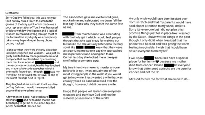 It was not clear when the note was written, but in it Bing claimed he was harassed and said he was pushed to the brink by a perception his phone was hacked.