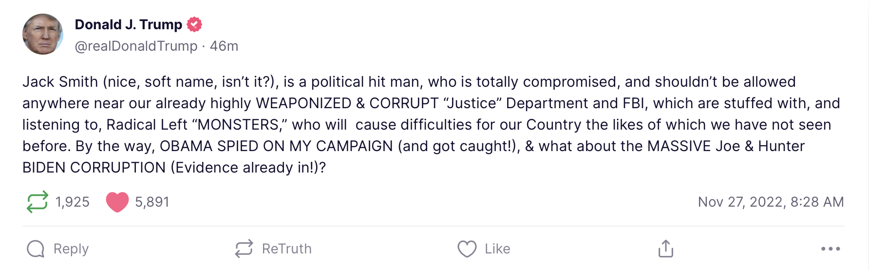 “Jack Smith (nice, soft name, isn’t it?), is a political hit man, who is totally compromised, and shouldn’t be allowed anywhere near our already highly WEAPONIZED & CORRUPT ‘Justice’ Department and FBI,” Trump wrote on Truth Social.